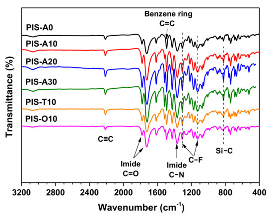 The chemical structure of the PEPA-terminated oligoimides containing siloxane structure were detected by FT-IR. As shown in the Figure 2, all the oligoimides had similar absorption peaks. The strong absorption peak near 2210 cm−1 was associated with the C≡C stretching vibration of phenylethynyl group. The absorption peaks near 1780 and 1720 cm−1 were attributed to asymmetric and symmetric stretching vibration peaks of C=O on the imide ring, respectively [21]. The characteristic absorption of 1370 cm−1 was related to the stretching vibration of imide C–N. Moreover, the absorption at 1500 cm−1 of C=C due to benzene ring as well as the absorption at 1303 and 1120 cm−1 of C–F stretching vibration were also observed [22]. However, the absorption at 1100 cm−1 of Si–O band was difficult to detect because of the overlap of C–F band at 1120 cm−1 and only the weak absorption around 820 cm–1 attributed to the stretching vibration of Si–C was observed for these oligoimides except PIS-A0 [23,24]. The Si–C absorption was shown to be slightly stronger with the increase of siloxane content. From the analysis of GPC and FT-IR, it can be inferred that the oligoimides have the designed number-average molecular weights and chemical structures.