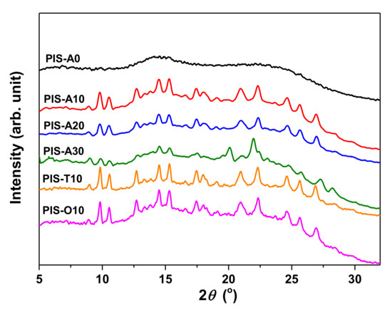 The XRD patterns of the oligoimides were shown in Figure 3. It can be seen that these oligoimide containing siloxane structure showed some crystalline peaks between 2θ angle 8°–28° except PIS-A0. This may be related to the low molecular weight of these oligoimides combined with the existence of flexible siloxane, which made the molecular chain easier moving and packing to form the ordered crystalline.