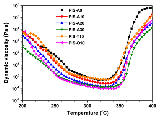 Resin transfer molding (RTM) put forward severe requirement for resin processing performance. Therefore, the key factors affecting the preparation of composites by RTM are the lower melt viscosities and excellent melt stability of oligoimides. The dynamic rheological behavior of the oligoimides are shown in Figure 4, and the corresponding dynamic viscosity data were listed in Table 2. The dynamic viscosity of all oligoimides dropped abruptly with the temperature increasing from 200 to 260 °C due to the softening of backbone, which then decreased gradually until the temperature enhanced to 330 °C. As the scanning temperature was over 350 °C, the dynamic viscosity increased abruptly due to the crosslinking of phenylethynyl group. Moreover, it can be seen that PIS-A oligoimides showed the lower minimum melt viscosity with the increase of siloxane content, which is 0.55 Pa·s for PIS-A0 and 0.12 Pa·s for PIA-A30, respectively. Comparing the oligoimides with different dianhydride structure, it is found that their minimum melt viscosity dropped in the order of PIS-T10 > PIS-A10 > PIS-O10. The PIS-O10 oligoimide derived from a-ODPA containing flexible ether linkage gave the minimum melt viscosity as low as 0.09 Pa·s at 333 °C. It is worth to mention that both of PIS-A30 and PIS-O10 oligoimides revealed the melt viscosity no more than 1 Pa·s in the temperature range of 260–280 °C, implying the broader processing window.
