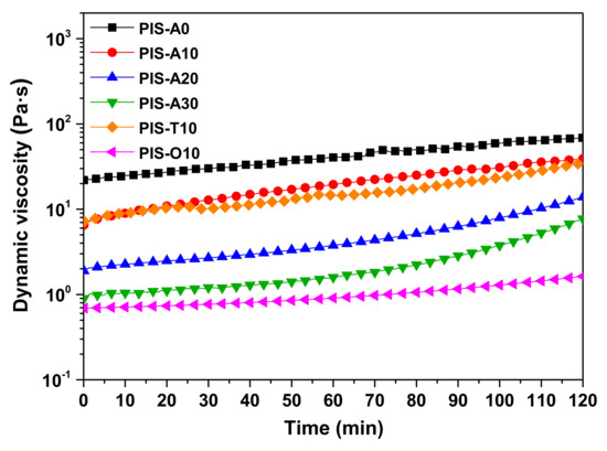 The melt stability of oligoimides has a great influence on the processing of the fabrication of composites. In order to investigate the melt stability of the oligoimides, the isothermal melt viscosity measurements at 260 °C were conducted. Figure 5 shows the dynamic viscosity curves of these oligoimides as a function of time, and the corresponding melt viscosity variations are summarized in Table 2. It can be seen that the melt viscosity of all the oligoimides increased with the isothermal measurement at 260 °C for 2 h. The PIS-A0 oligoimide without siloxane structure revealed the largest melt viscosity variation of 21.92–69.09 Pa·s, while PIS-A30 with relatively higher siloxane content gave the better melt stability with the melt viscosity variation of 0.90–7.74 Pa·s. In addition, the order of contribution of dianhydride structure to melt stability of the oligoimides was a-ODPA > a-BTDA > a-BPDA. The PIS-O10 had the most excellent melt stability with the slightly change of melt viscosity from 0.69 to 1.63 Pa·s during the isothermal treatment at 260 °C for 2 h. We suspected that the fractional free volume of the oligoimides maybe affect their melt stability.