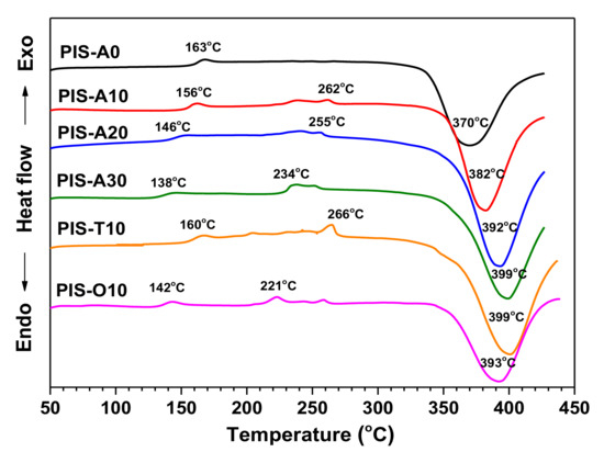 Figure 6 compared the DSC curves of oligoimides with different siloxane content and different isomeric dianhydrides. It is noted that these oligoimides revealed a weak Tg in the range of 138–163 °C. Moreover, these oligoimides with higher siloxane content gave the relatively lower Tg. For PIS-A oligoimides, the Tg of PIS-A30 is 25 °C lower than that of PIS-A0 owing to the existence of flexible siloxane. Comparing the Tgs between the oligoimides with different dianhydride structure, it is found that the PIS-T10 oligoimide gave the higher Tg value of 160 °C. On the other hand, the PIS-O10 oligoimide showed the lower Tg value of 142 °C because of the introduction of flexible ether linkage as compared to that of PIS-A10. The additional crystallization melting endothermic peaks in the temperature range of 220–270 °C were also detected for these oligoimides, except for PIS-A0. Combined with the crystal diffraction peaks observed on the XRD patterns, it can be concluded that the endothermic peaks are associated with the melting of crystallites [25,26]. These oligoimides also exhibited the exothermic peaks at 370–399 °C, which can be attributed to the crosslinking reaction of the phenylethynyl group. Moreover, it is also noticed that the exothermic peaks of PIS-A oligoimides were detected at the higher temperature accompanied with the siloxane content increasing. It is suspected to be related to the ether structure, which has some degree retarding impacts on the curing reaction of phenylethynyl group [27]. The PIS-A30 with the highest ether bond loading showed the highest exothermic peak value at 399 °C.