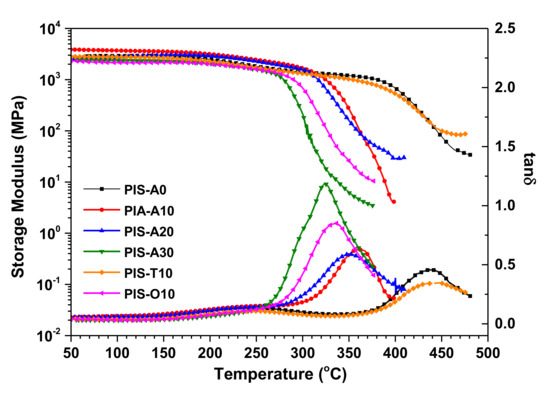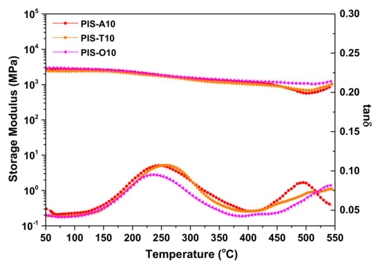The inorganic silica-like domains formed after postcuring at elevated temperature can enhance the thermal stability of the polyimide resins with siloxane structure. Therefore, the postcuring effect on the thermal properties of siloxane-containing polyimide derived from different isomeric dianhydrides were investigated. From DMA curves of these polyimide resins after postcuring at 450 °C, shown in Figure 11, it is found that the storage modulus revealed no obvious decrease even as the scanning temperature exceeding 460 °C, suggesting their thermal stability extremely improved. In the tanδ curves, the strong subglass relaxation peaks owing to 2,2′-disubstitutes of benzidine moiety with –CF3 around 250 °C combined with broad glass transition peaks over 498 °C were detected. Moreover, it is noticed that the glass transition peak of tanδ even exceeding the testing temperature range of 550 °C for PIS-T10 and PIS-O10 after postcuring at 450 °C.