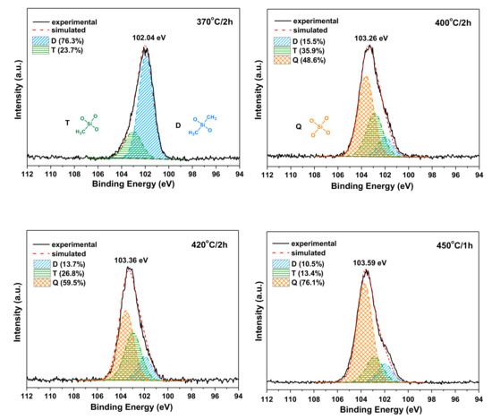 The structure evolution of siloxane before and after postcuring at different temperature and time was investigated by XPS analysis. As shown in Figure 10, the Si 2p peak was centered at 102.04 eV for PIS-O10 as cured at 370 °C for 2 h, which shifted to the higher binding energy with the increase of postcuring temperature. It is noted that the binding energy of Si 2p for PIS-O10 after postcuring at 450 °C was centered at 103.59 eV. It is well known that when an oxygen atom substitutes an alkyl group attached to the silicon atom, the binding energy of a siloxy unit will increase. Generally, the Si 2p spectra can be fitted with three components, which is the 101.90, 102.90 and 103.50 eV corresponding to the siloxy units of D[(CH3)2SiO2/2], T[CH3SiO3/2] and Q[SiO4/2], respectively [19]. The curve fitting results of the Si 2p peak for as cured PIS-O10 at 370 °C only gave the D and T siloxy units with the concentration of 23.7 and 76.3 at.%, respectively. However, after PIS-O10 was postcured at 400 °C, the Q siloxy units appeared because of the further siloxane oxidation. In the meantime, the increasing intensity of T siloxy units was combined with decreasing D siloxy units. There is more Q component combined with less D and T siloxy units with the increasing of postcuring temperature and extension of postcuring time for PIS-O10. The curve fitting results of Si 2p XPS listed in Table 5 show that PIS-O10 after postcuring at 450 °C for 1h gave the Q siloxy units with a concentration as high as 76.1 at.%, and that for D and T siloxy units, only 10.5 and 13.4 at.%, respectively. The results indicate that the siloxane structure in polyimides undergoes the oxidative crosslinking with the increase of postcuring temperature and time. After PIS-O10 was postcured at 450 °C, most of the siloxane structure is finally converted into inorganic silica structure, which leads to the enhancement of Tg. This can also well explain why polyimide resins with more siloxane content have higher amount of char residue as tested in the air.