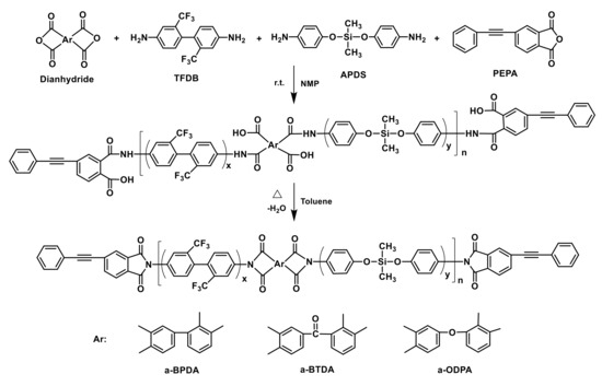 4-Phenylethynylphthalic anhydride (PEPA) and 2,2′-bis(trifluoromethyl)benzidine (TFDB) were purchased from Changzhou Sunlight Fine Chemicals Co., Ltd., Changzhou, China, and dried under vacuum for 12 h at 120 °C prior to use. 2,3,3′,4′-biphenyltetracarboxylic dianhydride (a-BPDA, Chenxing Chemical, Yancheng, China), 2,3,3′,4′-benzophenonetetracarboxylic dianhydride (a-BTDA, Bohai Chemical, Wuxi, China) and 2,3,3′,4′-diphenylethertetracarboxylic dianhydride (a-ODPA, Shanghai Research Institute of Synthetic Resins, Shanghai, China) were obtained from commercial suppliers and dried under vacuum for 12 h at 120 °C prior to use. Bis(4-aminophenoxy)dimethyl silane (APDS) was purchased from Gelest (A Meryer Chemical Technology Shanghai Company, Shanghai, China) and used as received. Commercially available N-methylpyrrolidone (NMP) was purified by vacuum distillation prior to use. Toluene was used as received.
