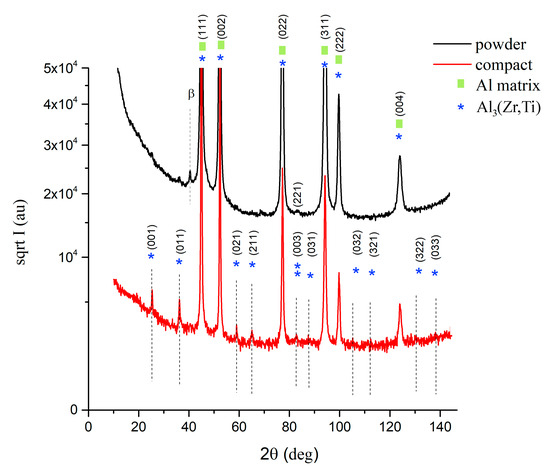 SPS of milled powder led to the precipitation of second phase particles as confirmed by XRD measurement. Figure 2 compares the XRD diffractograms of the milled powder and sintered samples (designed as compact in Figure 2). Additional peaks found in the sintered sample correspond to Al3(Zr,Ti) particles with the L12 structure. Rietveld analysis showed, that the sample contained 6.4 wt % of these second phase particles.