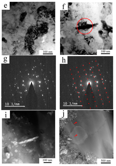 TEM imaging (Figure 3c) revealed that areas of grains with a size of a few micrometers are surrounded by areas with fine grains with a mean grain size around 100 nm. As on TEM images it is hard to see the second phase particles especially in the region of the fine grains, STEM imaging with small camera length was carried out, which increased the proportion of the atomic number contrast over diffraction contrast. Figure 3d enlarges the right bottom part of Figure 3c allowing us to compare the same region (in the same sample tilt) using TEM and STEM with a small camera length. It shows the high density of second phase particles among the fine grained region. Higher magnification TEM imaging revealed that most of the fine grains remained non-recrystallized (Figure 3e). As some second phase particles were in the given tilt of the TEM sample oriented to the strong diffraction, they appeared dark and could be recognized as a second phase particle among the small grains. One of such a particle is presented in Figure 3f. SAED pattern taken from the area marked by a red circle is presented in Figure 3g, which was evaluated as a diffraction pattern from the <011> zone of the Al3(Zr,Ti) particle. Figure 3h shows the overlay of the theoretical diffraction pattern of the <011> zone with the experimental pattern and gives a good correlation. The remaining diffraction spots are from the grains around the oriented second phase particle. STEM imaging with short camera length shows the same second phase particle revealing higher content of the element with a higher atomic number (Figure 3i). Figure 3i also reveals further areas with brighter and darker contrast, the brighter were found to be rich on Zr, Ti or Fe, whereas darker particles contained O. STEM imaging of the regions of coarse grains revealed some second phase particles (red arrows in Figure 3j), which (according to STEM-EDS measurements) contained an elevated amount of Zr and Ti compared to the neighboring matrix, but a thorough study of the second phase particles in the fine and coarse grained regions is out of the scope of this paper and will be reported elsewhere.
