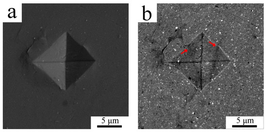 The mechanical properties both of powder and sintered samples were tested by a microhardness measurement. Due to the small size of the milled powder particles the minimum possible load of 98.07 N was applied to make an indent to avoid any deleterious effects. As the diameter of the indents was around 10 µm only the powder particles with the largest polished cross-sections could be tested to diminish the effect of powder edges and the resin itself. The average Vickers microhardness of the milled powder was 163 ± 15 HV0.01. The microhardness of the sintered sample was found to be slightly lower with an average of 137 ± 25 HV0.01, the values ranging from 74.2 up to 161 HV0.01 were measured. The lowest values were measured in areas where the indentation was performed partially in the coarse grained region, an example of such a region is presented in SEM-SE/BSE pair Figure 4a,b. It can be seen in Figure 4b that the indent is crossed by two lines of coarse grained areas (denoted by arrows). The SEM-SE/BSE pair in Figure 4c,d shows a smaller indent inside the fine grained area revealing its higher microhardness.