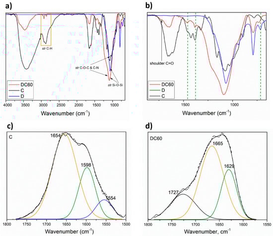 (a) FTIR of C, D and DC60 powders. (b) Selected wavenumber range, 600–2000 cm−1, for C, D and DC60 powders. (c) FTIR deconvolution of C sample in the wavenumber range, 1500–1800 cm−1. (d) FTIR deconvolution of DC60 sample in the wavenumber range, 1550–1800 cm−1.