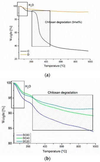 TGA of (a) C, D and (b) diatomite chitosans (DCs) powders.