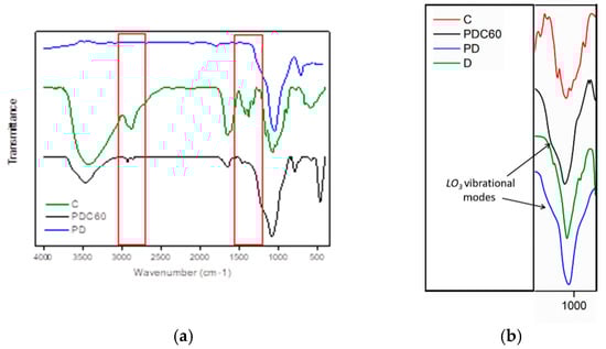 In Figure 4a, the FTIR spectra related to C, PD and PDC60 are reported. As observed, generally, the PD and PDC60 spectra highlighted the characteristic peaks of their main components (diatomite and chitosan), which indicates that chitosan was well embedded on diatomite structure. In addition, in Figure 4b) the FTIR spectra of PD and PDC60 in the range 900–1200 cm−1 are analyzed and compared with their constituent, D and C, in the 900–1200 cm−1. It is possible to observe that (as aforementioned reported) the D sample showed a broad absorption peak centered at 1070 cm−1 frequency that was assigned to the Si–O–Si asymmetric stretching peaks typical of silicate species [9,31,32]. The PD and PDC60 systems evidenced, in addition to the main band centered at 1050 cm−1 for the PD and 1081 cm−1 for PDC60, a further shoulder located around 1215 cm−1 ascribed to specific vibrational modes (namely, LO3 modes: Si–O–Si asymmetric stretching [9,40] means that the structure is highly crosslinked [40,41]).
