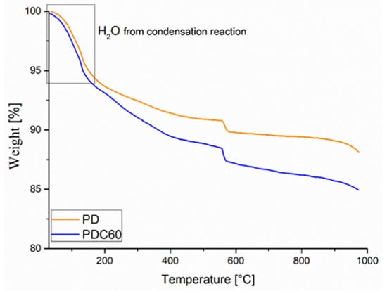 The PDC60 was also characterized through TGA analysis, and the thermogram is reported in Figure 6 and compared with pristine PD. As observed, both samples showed three degradation steps: the first occurs in the range 50–200° with weight loss of 5–6 wt% can be correlated to the consequence of the removal of the water comes from the condensation reactions of the sodium silicate solution [7,8,31]. The second and the third steps are attributed to the thermal degradation of the sodium hexafluorosilicate (catalyst), for instance, the first degradation of unreacted sodium hexafluorosilicate and the third (higher) weight loss to the vaporization of melted NaF [42,43], as well described in Galzerano et al. [9]. Furthermore, for the PDC60 in the range 250–400 °C, the chitosan degradation was also observed.