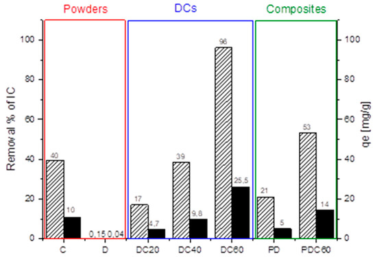 Removal percentage (dashed) and uptake capacity (black) of Indigo Carmine (IC) from water due to: raw materials (C and D), diatomite–chitosan-based powders (DCs) and porous materials (PD and PDC60).