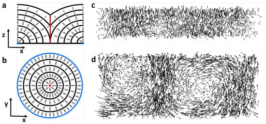 Circular domains in smectic and cholesteric liquid crystals (LCs). (a,b) Schematic of toric focal conic domains (FCDs), side view (a) and top view (b). The schematic highlights the smectic layers and the LC molecular arrangement. The central defect line is shown in red and the singular points at the edge of the defect are shown in blue. (c,d) Simulations of circular cholesteric domains, side view (c) and top view (d). The glyphs indicate the molecular arrangement. Computer simulations were performed minimizing the Landau–deGennes free energy [24] of chiral LCs confined in a channel with one homeotropic wall and three planar walls.