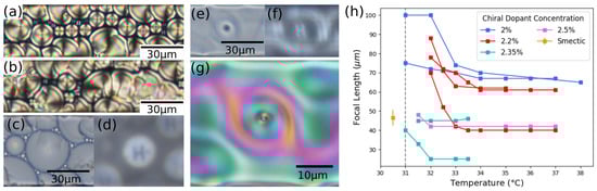 Below 31 °C, 8CB is in the smectic phase, and round toric FCDs form reliably in the microchannels (Figure 2a). However, chiral dopant partly disrupts the FCDs (Figure 2b), as the smectic phase is incompatible with twist deformation, and this is especially evident in the smaller channels. We choose to focus on the 40 m channels, which can accommodate well-formed, round FCD with diameter ranging from 10 to 30 m in their center, which work as lenses (Figure 2c,d). FCDs are erased by heating above the smectic-nematic transition temperature. The focal length depends on the diameter of the FCD [27]. Uncertainty in focal length measurements is due to a combination of effects, as the images are sometimes blurry as a consequence of some irregularity in the FCD structures. In the presence of large arrays of FCDs of similar size, we can determine their average focal length from visual inspection. Uncertainty is also attributed to drift in the heating stage, which due to thermal expansion is up to 5 m over 10 °C. Even with these caveats, it is possible to measure and compare the focal length of FCDs for mixtures of 8CB and chiral dopant at various concentrations and test their stability against temperature changes. Our results indicate that, within the explored range of chiral dopant concentration, the average size and the focal length of the FCDs do not change significantly, and that the focal length remains constant throughout a temperature range between 23 °C and the smectic-nematic transition.