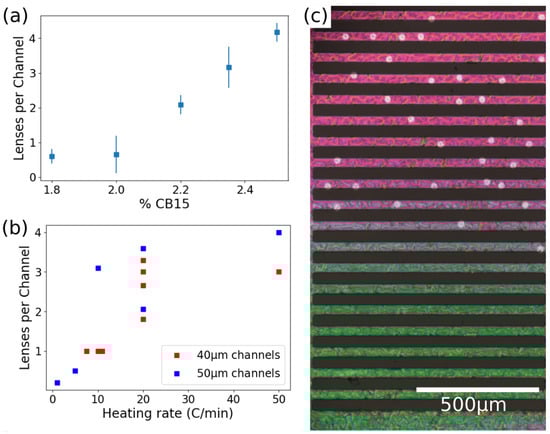 Formation of circular domains. (a) Number of circular domains for various concentrations of chiral dopant. (b) Number of circular defects formed as a function of heating rate in channels 40 and 50 m wide. Every point corresponds to one experiment, in which the system was heated up to 36 ± 1 °C (far beyond the transition temperature) and in which the domains were counted. (c) Polarized microscopy image of the channels in the cholesteric phases. The circular domains can be clearly identified as brighter clear circles. It is possible to notice how the channels with the thinner layer (top) have more circular domains.