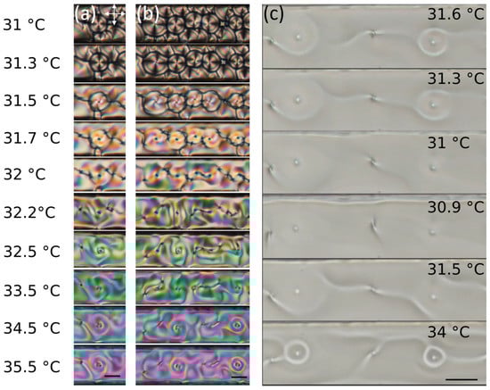 Memory at the smectic-cholesteric transition. (a,b) Two sequences of images from details of the supplementary video V2 showing defects heated up from smectic to cholesteric, with temperature ranging from 31 to 35.5 °C. It is possible to see how memory is retained at the phase transition. (c) Sequence of images from supplementary video V3 showing a circular cholesteric domain. The domain is cooled near the phase transition down to 30.9 °C (it is possible to see the “unwinding” of the cholesteric helix) and then heated up again to 34 °C before it turns into smectic, retaining its defect structure. All scale bars are 20 m.