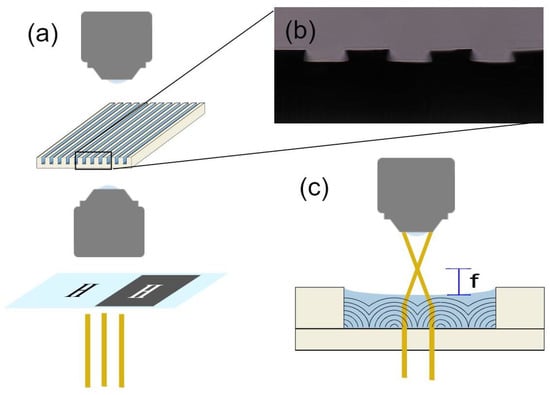 The samples are observed using bright-field microscopy with a Nikon Eclipse LV110N Pol equipped with a DS-Ri2 (Nikon, Tokyo, Japan) camera. A sample is placed on a water-cooled heating stage Instec HC S302 MK 2000 (Instec Inc., Boulder, CO, USA) using various heating and cooling rates. In order to see the lensing effects created by structures in the sample, we use ‘masks’ consisting of black poster-board with shapes cut out or glass slides with corresponding shapes inscribed using a dark marker. The masks are placed between the microscope lamp and the condenser and used to project images onto the sample, as shown in Figure 5a, then the focal length is estimated as shown in Figure 5c.