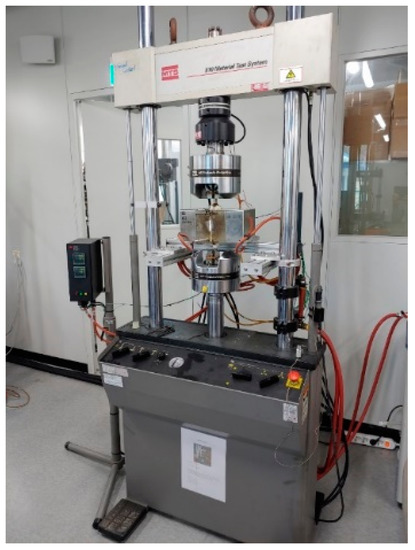 In the current study, hot tensile tests for 316-type stainless steel were done in the MTS-810 servo hydraulic material testing machine (Figure 1). The planar specimens for the tests were prepared by wire-EDM machining. Figure 2a shows the dimensions of the specimen and Figure 2b shows the actually prepared specimen. The high-temperature tensile experiments were done at strain rates of 0.0002 s−1, 0.002 s−1, and 0.02 s−1, at temperatures of 800 °C, 900 °C, and 1000 °C, for each strain rate.