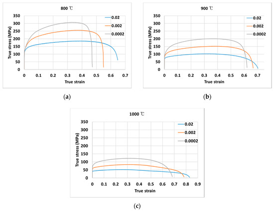 True stress-true strain curves at (a) 800 °C, (b) 900 °C, (c) 1000 °C.