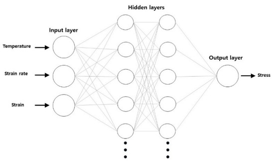 Figure 6 is a schematic diagram of the developed neural networks. Each of the neural networks has three layers, namely input, hidden, and output layers. In this study, two hidden layers were used in the developed model. Each layer has neurons. For example, the input layer has three neurons, which represent the temperature, strain rate, and strain. Neurons are processed in terms of their weight numbers. During the operation of the neural networks, the numbers received by a neuron from the neurons in the previous layer are processed according to the weight number of the current neuron. After the calculation, the calculated number is delivered to the neurons in the next layer in order. In the current model, the final value is received by the output layer with one neuron, which represents the flow stress of hot deformation. The numbers of hidden layers and neurons in the hidden layers directly and significantly influence the accuracy of the prediction results. Gupta et al. [12] employed a single hidden layer with 15 hidden neurons. Li et al. [13] employed 18 hidden layers and Sabokpa et al. [14] employed 15 hidden neurons in a single hidden layer. In this research, the accuracy of the neural networks changed irregularly with the change of the numbers of hidden layers and neurons. Therefore, the ideal number of hidden layers and hidden neurons are decided after many simulations on a trial and error basis. In the current model, 250 neurons are used for each hidden layer. The activation function is the RELU (rectified linear unit) function. Training the neural network for good prediction accuracy involves obtaining the most appropriate set of weight values of neurons. For the current model, a back-propagation training algorithm with ADAM optimization was adopted. Mean square error is employed as a loss function for evaluating the performance of the neural networks during the training. Learning rate and weight decay are the parameters related to the amount being modified during the update of the weight of the neurons. In this research, 0.001 and 0.1 are chosen for learning rate and weight decay. In this research, the weight decay was set as 0.1 and the learning rate was set as 0.01. For the development of the neural networks, Keras (a Python package) was utilized. For the training data of the current model, 324 points of data were chosen randomly from nine stress-strain curves for the strain range from 0.05 to 0.45. Another 81 points of data from the same nine curves for the strain range from 0.05 to 0.45 were chosen to test the developed model. To train the neural networks, training data is normalized by the equation below: