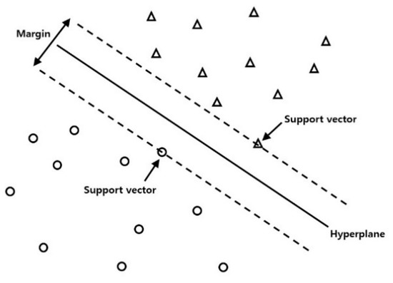 SVR (support vector regression) [15] is an applied type of SVM (support vector machine) classification algorithm. In SVR, the data is split into groups by hyperplane. The distance from the hyperplane to the data at each group’s boundary is called the margin, and the data on the marginal boundary is called the support vector. The purpose of training the SVR is to find the optimal hyperplane with the largest margin. Figure 7 shows a schematic diagram of the support vector machine algorithm with the original linear hyperplane. For the training of the current data, the relationship of input data with the output data is nonlinear and complex. Therefore, a new hyperplane is induced to a feature space by the kernel method to help train the nonlinear dataset. A Python package (Scikit-learn) was used in the current study. The regularization parameter is chosen to be 5000, and the epsilon value is chosen to be 0.003. Table 3 lists the process parameters for the developed SVR model.