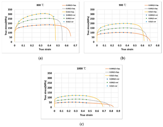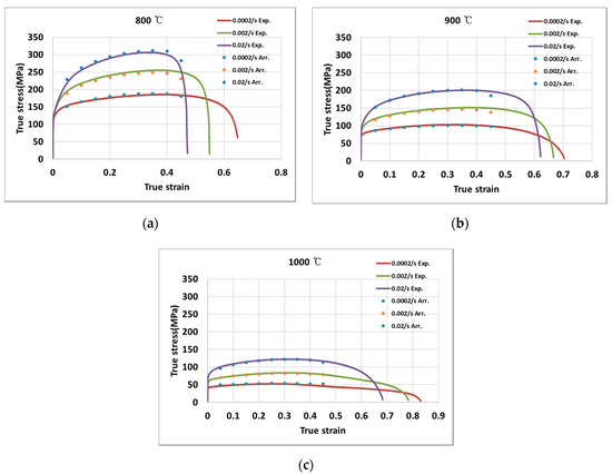 Figure 8a–c shows the calculated true stress by the Arrhenius equation indicated on the experimental curves for 800 °C, 900 °C, and 1000 °C, respectively, when the strain rates are 0.0002 s−1, 0.002 s−1, and 0.02 s−1, respectively. The stresses predicted by the Arrhenius equation were close to the experimental values. The RMSE (root mean square error) for the stress by the Arrhenius equation was found to be 5.59.