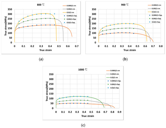 Figure 9 shows the calculated true stress by the neural networks indicated on the measured stress for the temperatures of (a) 800 °C, (b) 900 °C, and (c) 1000 °C, when the strain rates are 0.0002 s−1, 0.002 s−1, and 0.02 s−1. The RMSE of the true stress using the neural network model was found to be 2.85. The results indicate that the true stress using the developed neural network is more similar to the measured values than the stress calculated by the Arrhenius equation. However, substantial effort was needed to obtain an appropriate model with good process parameters. In addition, the neural network model was computationally more expensive.