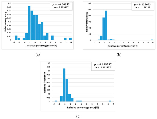 In this research, a study on relative percentage errors by three algorithms was done. Figure 11 shows the relative frequency of errors versus relative percentage error using (a) Arrhenius equation, (b) neural networks, and (c) the support vector machine algorithm. The plots (a), (b), and (c) for three algorithms are provided with mean value, and standard deviation of relative percentage errors as Equations (11) and (12):