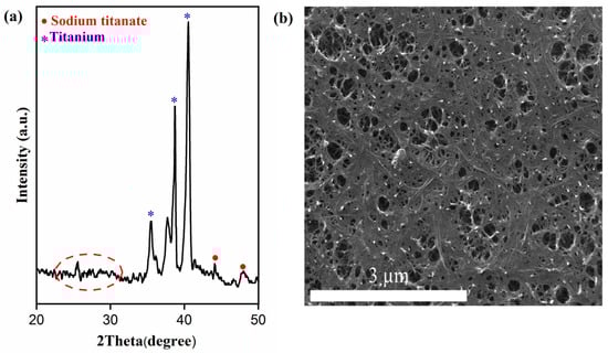 (a) XRD pattern and (b) SEM image of Ti6Al4V substrates after alkali-treatment approach.