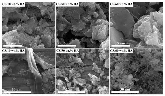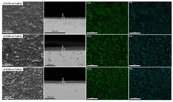 SEM images and EDS mapping of CS/HA coatings with different HA content (10, 50 and 60 wt.%) are showed in Figure 2. The SEM images represented the formation of crack-free coatings without any imperfections, especially at CS/10 wt.% HA coating. In addition, the cross-section images also revealed the formation of dense and uniform coatings with a thickness in the range of 15–50 µm, absence of any delamination or mismatch at the coatings/Ti6Al4V substrate interface which could be due to the alkali-treatment of the substrates. In addition, EDS mapping-analysis confirmed the homogenous distribution of HA, specifically at CS/10 wt.% HA coating. Meanwhile, in the samples with higher HA amount (CS/50 wt.% HA and CS/60 wt.% HA coatings) some clusters of HA nanoparticles were observed. Furthermore, the size/shape of HA crystalline depends on the [Ca2+] and [PO43−] ion concentration or the rate of crystalline growth []. Indeed, SEM images and EDS mapping of CS/HA coating consisting of 50 and 60 wt.% HA indicated that higher [Ca2+] and [PO43−] concentration accelerated the crystalline growth rate and agglomeration. Moreover, with increasing HA content, the surface morphology of CS/HA coatings changed due to variation of nucleation and HA crystals growth with an improvement of surface roughness. In the homogeneous and smooth CS/10 wt.% HA coating, HA crystals grew slowly with uniform distribution. In contrary, incorporation in the coatings of HA at higher amount (50 and 60 wt.% of HA) resulted in the formation of much denser and roughness surface. According to the EDS analysis of CS/HA coatings (Supplementary Figure S1), HA with Ca/P ratio around 1.74 (CS/10wt.% HA), 1.63 (CS/50 wt.% HA), and 1.68 (CS/60 wt.% HA) was obtained in the composite material.