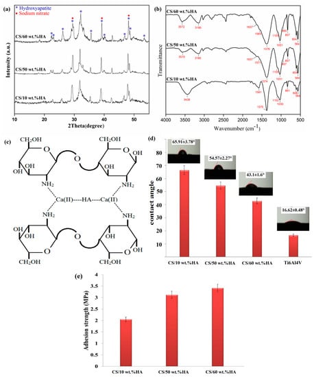 (a) XRD patterns and (b) FTIR spectra of CS/HA with 10, 50 and 60 wt.% of HA (c) Interaction between Ca2+ of HA and –NH2 of chitosan (d) Contact angle between the water drop and the sample surfaces (e) Adhesion strength of the CS/HA coatings.