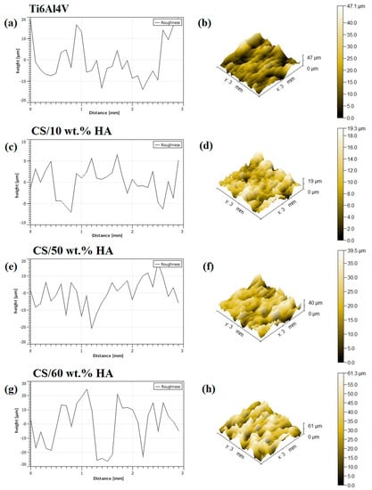 The surface roughness is a well-known factor that determines the biological properties such as apatite layer deposition in SBF and cellular responses []. Based on the clinical results from retrieved implants, rough surface of implants can improve the ingrowth of soft and hard tissue into the materials, thereby making more biological anchorage to enhance the stability of the Ti-base implant []. The surface roughness of the alkali-treated Ti6Al4V substrate and CS/HA coatings was estimated using profilometer applying a laser sensor. The 2D and 3D optical interferometry images are showed in Figure 4. Results approved the presence of porous structure obtained during alkali-treatment according to enhance in the surface roughness (Ra = 8 ± 2 µm). This topography has promoted a good bonding among Ti6Al4V substrate and CS/HA coating. Compared to CS/10 wt.% HA coating, the CS/50 wt.% HA and CS/60 wt.% HA exhibited more surface roughness (CS/10 wt.% HA, Ra = 2.88 ± 1.5 µm; CS/50 wt.% HA, Ra = 6.67 ± 2.1 µm; CS/60 wt.% HA, Ra = 12.93 ± 4.5 µm). The surface roughness improvement of coated specimens with increasing HA content might be due to the agglomeration of HA in the chitosan matrix and the increased surface inhomogeneity. The surface roughness results were in agreement with the SEM results. Previous studies have reported the surface roughness of the coated implants was measured to be between 1 and 20 μm according to the Ra parameter [,].