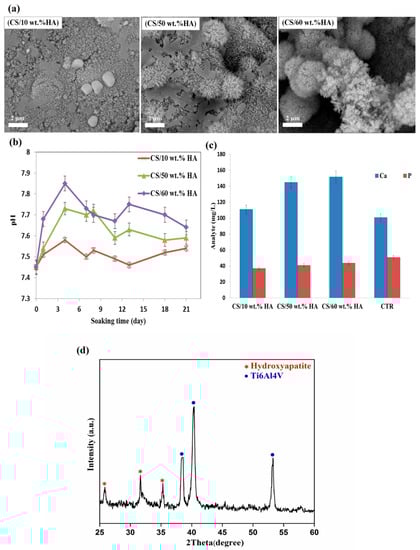 The bioactivity potential in SBF solution has been regarded as a key evidence of bone-like apatite layer production on the material surface that is an essential condition to achieve direct bonding with living bone []. Figure 5a represents SEM images of CS/HA coatings at day 21 of incubation in SBF. All samples showed the nucleation of apatite particles on the surface of CS/HA coating. In particular, SEM images of CS/10 wt.% HA coating showed that surfaces were coated with formless apatite particles after 21days of soaking in SBF. A typical “cauliflower” morphology was distinctly observed for CS/50 wt.% HA and CS/60 wt.% HA samples after 21 days of incubation, in which each apatite particles included many needle-like crystals. The surface morphology for CS/60 wt.% HA coating indicated highly dense apatite deposition and growth compared to other samples. It appears that because of the increasing HA content in coating, more nucleation sites were offered to promote nuclei formation and crystallization of apatite layer. Indeed, the formation apatite-like layer may be modulated by altering the quantity of HA in the composite during the immersion in SBF []. Samandari et al. [] found that nano-HA particles in the nanocomposite scaffolds played the primary role in apatite layer formation. According to Figure S2, the deposition consisted of Ca and P atoms with the ratio around 1.64 (CS/10 wt.% HA), 1.66 (CS/50 wt.% HA), and 1.61 (CS/60 wt.% HA), which were close to 1.67 of bone-like apatite. During SBF treatment, pH values of SBF solution were changed depending on the sample type (Figure 5b). The increasing rate of pH value depended on CS/HA composition. In composite with 10 wt.% HA, the pH values did not change remarkably. Increasing the amount of HA led to more pH changes. The pH value of SBF solution in all coated samples increased during the first five days of incubation, due to the exchange between hydrogen ions within the SBF solution and cations. Then, by increasing the soaking time for all samples a decreasing of pH values and the formation of bone-like apatite layer were observed []. Moreover, the variations of Ca and P ions concentrations during the SBF treatment of all samples for 21 days were reported in Figure 5c. The obtained results indicated that Ca ions concentration of the SBF solutions increased after day 21 of treatment. Conversely, phosphorus ions were consumed in the SBF solution and decreased gradually after 21 days soaking in all coated samples. The release of Ca2+ (Figure 5c) and the increased pH value of the SBF solution (Figure 5b) may be described by the Kokubo exchange mechanism for the formation and growth of the apatite on the surface coatings [,]. As reported in the previous studies, when the CS/HA coating was immersed in SBF solution, the coatings react with the SBF solution. In this way, dissolution and re-precipitation of coated specimens occur, leading to the formation of apatite [,]. Furthermore, the XRD pattern (Figure 5d) confirmed the apatite formation on the surface of CS/60 wt.% HA coating after biomimetic treatment for 21 days and it was also determined the low crystallization similar to the HA of natural bone. Finally, SEM images, XRD, ICP investigations and pH changes results suggested that the CS/HA coatings prepared by the in-situ sol-gel process were bioactive. The obtained results demonstrated that the presence of hydrophilic nanocomposite coating with higher HA content (CS/60 wt.% HA) in the SBF solution provided more nucleation sites and might accelerate the apatite mineralization and suggesting a good bioactivity []. It has been reported that the bioactive coatings could promote an attachment of bone to the implant and improved osseointegration between implant and host tissue [,]. These findings suggested that increased bond strength and accelerated osteoconductivity are very important aspects of CS/HA coated implant applications.