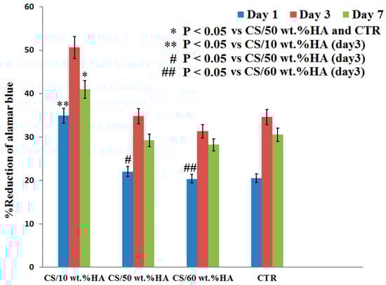Furthermore, in vitro biological study was performed to evaluate the effect of surface properties on cell proliferation []. In particular, hMSCs proliferation was quantified after one, three, and seven days of culture on the CS/HA coatings, and the results are shown in Figure 6. Results demonstrated that the cell proliferation for all samples showed the same behavior of control (CTR) with the peak at day 3 of incubation time, suggesting that the CS/HA coated samples could support the hMSCs proliferation without any cytotoxic effect. In particular, according to the results, after day 1 of culture, the cell proliferation on all of the coating increased and, CS/10 wt.% HA coating presented the highest proliferation compared to other samples. By increasing HA content, there were no significant differences between CS/50 wt.% HA and CS/60 wt.% HA coatings (P > 0.05). A greater proliferation rate occurred between one and three days followed by a slow-down until 7 days. There was a significant difference in cell proliferation among the CS/HA coatings with 10, 50 and 60 wt.% of HA at one day compared to three days (P ˂ 0.05). Considerable differences were observed at day 3 for CS/10 wt.% HA vs CS/50 wt.% HA and control (CTR) (P ˂ 0.05). This behavior was similarly reported by Xianmiao et al. [] who prepared hydroxyapatite/chitosan membranes for enhanced guided bone regeneration. They disclosed that the CS/HA membranes had no negative effect on the cell viability and possess good biocompatibility.