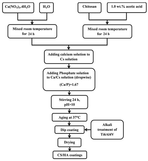 CS/HA coatings containing different amount of HA, 10, 50 and 60 wt %, were synthesized by sol-gel technology. Initially, 10 wt.% chitosan solution in 1.0 wt.% acetic acid was prepared after 60 min stirring at 50 °C. The solution was stirred for 24 h at 25 °C. For the in situ synthesis of HA, calcium nitrate tetrahydrate (Ca(NO₃)₂·4H₂O) and di-ammonium hydrogen phosphate ((NH4)2HPO4) were separately dissolved in distilled water (dH2O) and stirred for 24 h at 25 °C. Subsequently, Ca-based solution was added to the CS solution and the mixture was stirred for 4 h. Then, the phosphate solution was introduced drop by drop to Ca/CS solution and stirred for 24 h. At last, sodium hydroxide solution (1 M, NaOH) was used to adjust pH about 10. The amount of Ca, P and CS solutions were modified to have the composite with the composition of 10, 50, and 60 wt.% HA in CS matrix. Before coating process, Ti6Al4V substrates with the dimension of 20 mm × 10 mm × 2 mm were mechanically polished with 240–1000 grit-sized SiC papers and ultrasonically cleaned in acetone for 30 min. The alkali treatment of Ti6Al4V substrate was executed by incubating the samples in NaOH (5 M) solution at 60 °C for 48 h at 27% RH (relative humidity). Then, the specimens were rinsed with dH2O and dried at 37 °C for 24 h in air atmosphere. The coating process was applied using a simple dip-coating process at 25 °C. In this regard, the alkali-treated Ti6Al4V substrates were dipped vertically into CS/HA solution and pulled out at a constant speed of 60 (mm/min) and then dried at 37 °C in air for 2 h at 27% RH. This step repeated two times to obtain a suitable thickness. Finally, the coated substrates were treated at 37 °C for 48 h. A schematic flow chart of processing is reported below (Scheme 1).