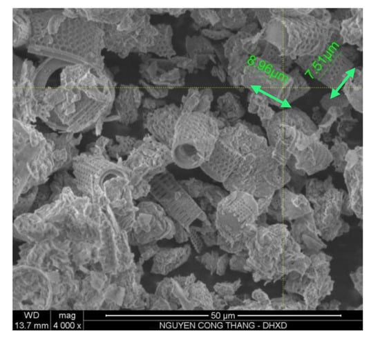The materials used in this study included quartz sand (S) with a mean particle size of about 300 μm, and Portland cement PC40 (C) (complying with Vietnamese Standard TCVN 2682: 2009 [22]). Zeolites (Ze) were employed as a partial replacement of cement to reduce the autogenous shrinkage of HPC. The effects of particles size were investigated by using zeolites with 3 mean particle sizes of 5.6, 10.3 and 16.7 µm (abbreviated as Ze-5.6, Ze-10.3, and Ze-16.7, respectively), measured by laser diffraction. The density of cement and zeolite were determined according to Vietnamese Standard TCVN 4030-03 and are shown in Table 1. The chemical and compositions of cementitious materials measured by X-ray fluorescence (XRF, S4 Pioneer, Bruker, Karlsruhe, Germany) are given in Table 2. The particle size distribution and the mean particle size of raw materials are presented in Figure 1. The morphology of zeolite particles was observed via scanning electron microscopy (SEM, S-4800, Hitachi, Tokyo, Japan) imaging, as shown in Figure 2. Polycarboxylate-based superplasticizer (SP, ACE388, BASF, Ludwigshafen, Germany) with 35% solid content by weight was used for controlling the workability of HPC mixtures.
