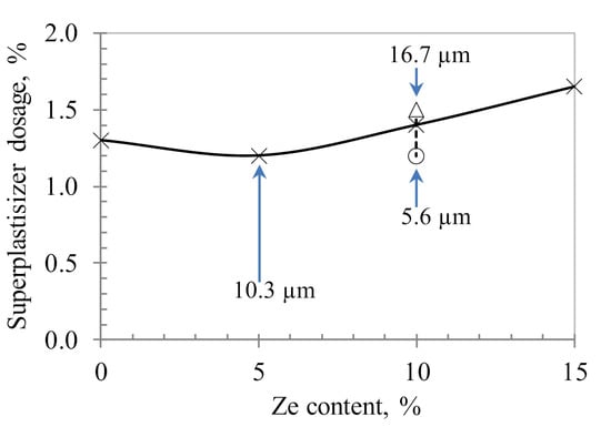 As mentioned, the workability of HPC mixtures was controlled by the superplasticizer to obtain the flowability diameter in the range of 200–230 mm. Dependency of the flowability diameter on the dosage of SP is shown in Figure 5. It can be seen that for zeolite with 10.3 µm size, the minimal required SP dosage to ensure the designed workability was obtained at 5% zeolite replacement. After reaching the minimal content, the higher the zeolite replacement content, the larger the SP dosage required. The required SP dosage for the control sample (e.g., without zeolite) was a bit higher than the one for the sample with 5% zeolite replacement, but much lower than the ones for higher zeolite replacements. In addition, with the same 10% zeolite replacement, when the size of zeolite particles increased from 5.6 to 16.7 µm, the required dosage of superplasticizer significantly increased, i.e., 25%. Typically, by adding a small amount of zeolite to the HPC mixture (e.g., 5% in this study), the workability is expected to be improved due to the filling and dispersion effects of very fine zeolite particles, resulting in a higher amount of free water in the paste matrix and thus improving the fluidity of the concrete mixture. However, if the zeolite content continues to increase, due to the large porous structure of zeolite particles as shown in Figure 2, a large amount of water is absorbed into its fine structure, hence reducing the workability of the concrete mixture. This is evident when the zeolite content increases up to 15%, which requires a higher amount of superplasticizer to obtain the designed workability (Figure 5). Furthermore, with a reduced zeolite size, the workability of the concrete mixture could increase because smaller size zeolite requires an intensive grinding, inducing a partial collapse of the porous structure of zeolite particles, thus reducing the amount of absorption water.