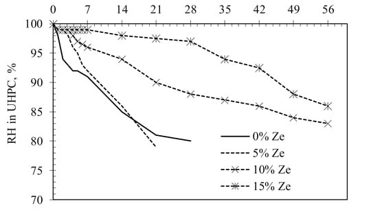 Experimental results of the effect of the zeolite content on the relative humidity reduction in HPC samples are shown in Figure 6. It is clear that for the control sample (0% Ze), the internal relative humidity of HPC quickly dropped to a value of 90%, 85% and 80% after 7, 14 and 28 days of curing, respectively. For samples using 5% zeolite, the RH reduction was initially slightly slower than that of the control samples. The RH reduction was then similar to the one of reference samples after 14 days of curing, as seen in Figure 6. When increasing the zeolite content to 10% and 15%, the RH in the HPC sample was slightly reduced in the first 7 days; especially, the RH of concrete with 15% zeolite content was almost stable within this period. While, at 28 days, the RH value was still over 95% but decreased to 86% at the age of 56 days for HPC containing 15% zeolite. Such high rates of RH reduction in samples using 10–15% zeolite compared to the control sample are attributed to the porous structure of zeolite particles. These porous particles can absorb and retain water and are well distributed in the hardened cement paste. When RH in HPC reduces due to the continuous cement hydration process, water retained in these porous zeolite particles will be released and offset some of the water loss due to hydration of cement, thus compensating the reduction of RH in concrete.