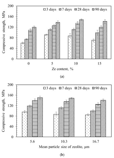 Effect of the zeolite content (a) and the particle size of zeolite (b) on the compressive strength of HPC specimens—tests were performed on 3 replicates.