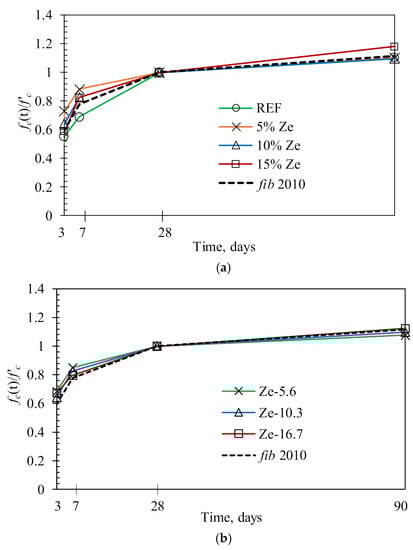where is the ratio of zeolite content relative to cement content by weight, (µm) is the mean particle size of zeolite and (= 1 µm) is the reference value for particle size. Note that has a positive sign compared to negative sign in the fib 2010 model.