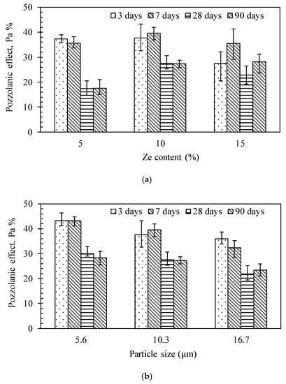 Effect of the zeolite content (a) and the particle size of zeolite (b) on the pozzolanic effect of zeolite in the HPC system.