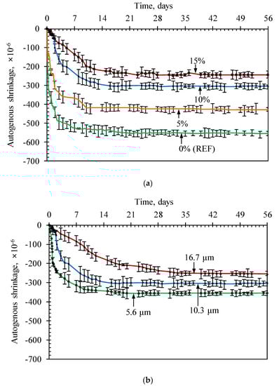Effect of the zeolite content (a) and the particle size of zeolite (b) on autogenous shrinkage of HPC specimens—measurements were performed on 3 replicates.