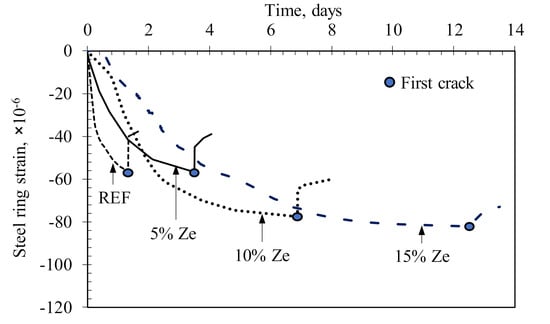 In this study, the possibility of cracking resistance due to the shrinkage of HPC containing different zeolite contents was carried out. Experimental results on deformation of steel rings due to shrinkage of concrete rings are shown in Figure 11. It appeared that the cracks of the reference sample (0% Ze) occurred after 1.3 days of casting. For HPC samples with zeolite, the cracks occurred at considerably later ages of 3.5, 6.8 and 12.5 days for 5%, 10% and 15%, respectively. Therefore, the use of zeolite plays an important role in limiting cracks, thereby slowing the process of cracking on concrete structures. The quick appearance of cracks in the reference sample can indeed be explained by the large shrinkage of HPC. When the amount of water in concrete is lost due to the hydration of cement, known as the self-desiccation process, in the hardened cement matrix, and due to evaporation of water to the environment, the relative humidity in concrete is decreased. Such dehydration process will cause stress in the pores of the concrete structure, which is considered as the total surface tension on the meniscus surface of water in the pore system of concrete, thereby causing shrinkage of concrete. For HPC, the self-desiccation process is stronger at the early ages compared to HPC using zeolite, as is clearly shown in Figure 6, resulting in a shorter period of cracking occurrence.