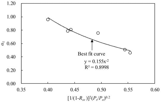 The present study selected 14 days as the specified time, because most specimens showed the inflection time to convert from the initial acceleratory period to flow period in the autogenous shrinkage strain curve at approximately 14 days. By using the present test dataset normalized by Equation (4), the value of in Equation (5) was calculated in each specimen. The value of was affected by the content and fineness of zeolite. From the regression analysis of determined in each specimen, the following equation for shrinkage time history could be obtained (Figure 12):
