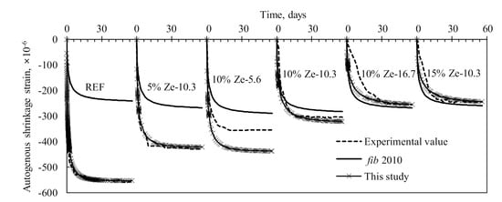 where is the coefficient to represent the slope of the time function, which is set to be –0.2 in the fib 2010 model on the basis of the test data of normal strength concrete. However, the rate of increment of autogenous shrinkage is affected by various conditions, including curing temperature, cement content, fineness and type of cementitious materials. This implies that the HPC with zeolite would exhibit a different shape of time function with the mitigation of autogenous shrinkage, as previously presented in Figure 10.