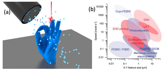 (a) Schematics of focused electron beam induced deposition (FEBID) for 3D nano-patterning, where gas injected by a nozzle is adsorbed on a substrate, with a fraction getting decomposed by a focused beam of electrons. By controlling the time the beam dwells on each point, 3D nano-printing of magnetic materials becomes possible. Reproduced with permission from [16]. Copyright 2020 American Chemical Society. (b) Comparison of speed and resolution of FEBID and its sister technique focused ion beam induced deposition (FIBID), with other emerging additive manufacturing methods for the direct writing of metallic micro- and nano- structures. FEBID at cryogenic temperatures (cryo-FEBID) enables direct-writing at very high growth rates, with slightly worse resolution [17,18]; a similar resolution as cryo-FEBID, with an approximately 100 increase in growth rate has been recently demonstrated using cryo-FIBID [19,20] (not shown here). Adapted with permission from [21].