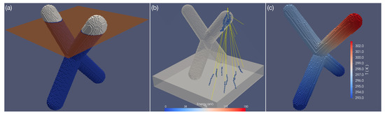 (a) Exemplary 3D computer-aided design (CAD) model of a ferromagnetic tetrapod structure with slicer plane for 2D pattern generation, for illustration. (b) Result of Monte Carlo simulation of several primary electron trajectories at 20 keV energy for tetrapod structure illustrating elastic scattering (yellow trajectories) and deposited energy (colour bar), due to inelastic scattering. (c) Temperature distribution in tetrapod structure under electron beam exposure at 20 keV and 44 pA beam current, when the electron beam hits at the topmost upper front arm (stationary state finite difference solution of heat conduction equation). The temperature increase is from 293 K at the base of the structure to about 303 K at the beam impact position; material parameters of Pt20C80.