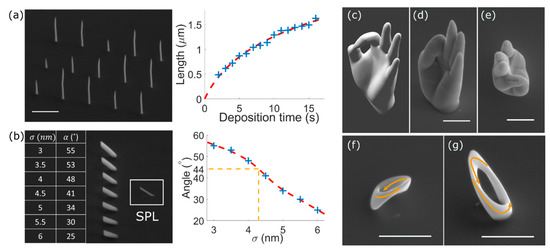 (a) An array of vertical pillars is built with varying deposition times. The height of the resulting structures is used to determine the base growth rate, and temperature scaling factor, reducing the growth rate as pillars get longer. (b) The effective standard deviation σ of the deposit is determined by comparing wide nanowires to a single pixel line (SPL), allowing correction for proximity effects. (c) Stereolithography (STL) model of a human hand. (d,e) Side and top view SEM images of the model fabricated with MeCpPt(Me)3. (f,g) Ferromagnetic Möbius strip made using Co2(CO)8, where arrows are included to help visualize the geometry. Scale bars are 1 µm. Adapted with permission from [16]. Copyright 2020 American Chemical Society.