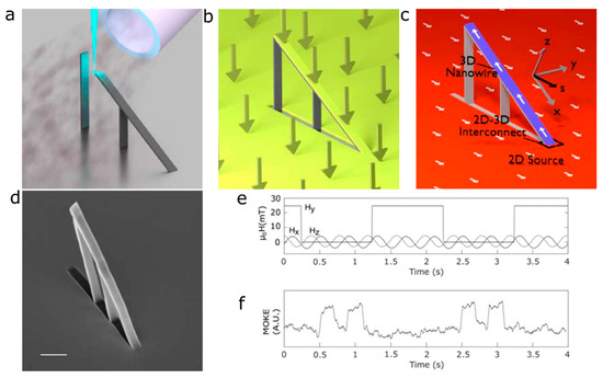 This approach has been successfully followed by using the standard MeCpPt(Me)3 precursor to fabricate 3D nanowire scaffolds, followed by the PVD of a thin layer of magnetically-soft permalloy film, with the nanowire smoothly connected to the planar substrate [65]. The domain wall motion in these devices was measured by optical means, using a new dark-field magneto-optical method that is capable of probing the magnetic properties of a 3D nanostructure surrounded by a magnetic substrate. Due to the nanowire and substrate being at different planes, these structures can exhibit a significantly more complex response to vector external magnetic fields than their 2D counterparts. Specifically, domain walls can be controllably generated in the substrate plane, pinned at the 2D-3D interconnect region, and injected into the nanowire. The injection can further be gated by applying a field transverse to the nanowire (Figure 5e,f).