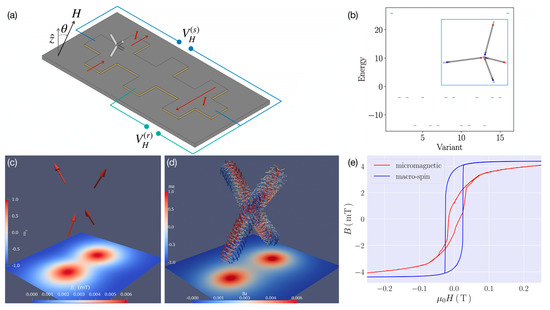 Furthermore, 3D nanowire networks are highly significant with regard to realizing extended magnetically frustrated systems on the meso-scale [84], as recently investigated via 3D FEBID Co3Fe tetrahedra by means of micro-Hall magnetometry. In these experiments, the magnetic stray field generated from a tetrahedra grown within the sensor area of a 2D electron gas (2DEG) semiconductor heterostructure was measured by means of the Hall voltage generated within the 2DEG (Figure 7a). Conceptually, such a tetrahedral building block consisting of uniformly magnetized cylindrical arms exhibits a sixfold degenerate magnetic ground state (Figure 7b). If extended into a 3D diamond-like lattice, this represents an artificial spin ice equipped with several tuning options, such as saturation magnetization and strength of dipolar coupling, something achievable in FEBID by diluting the magnetic component via the mixture with other precursor, as well as by scaling the lattice constant. In this case, however, 3D cylindrical structures of 60–70 nm in diameter made vortex-like local magnetization distributions energetically favored [85]. Therefore, whereas a simple macro-spin model could reproduce concise features in some of the measured magnetic hysteresis curves, these were reproduced more quantitatively via full micromagnetic simulations [27] (see Figure 7c–e). The magnetic frustration effects associated to these curvature-induced magnetization structures is a work in progress.